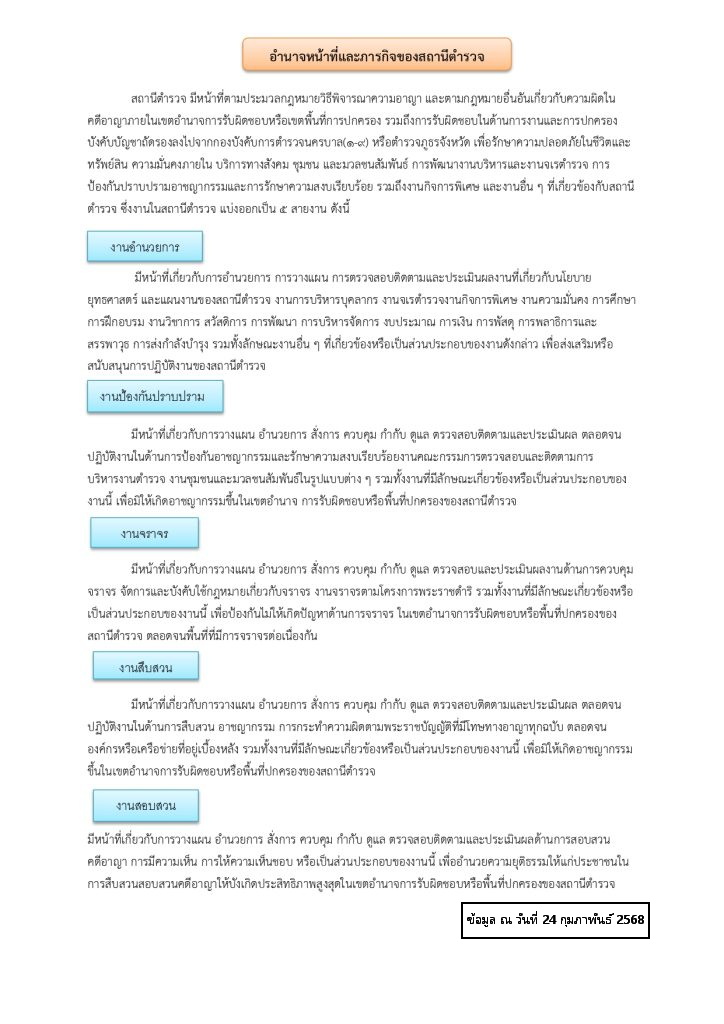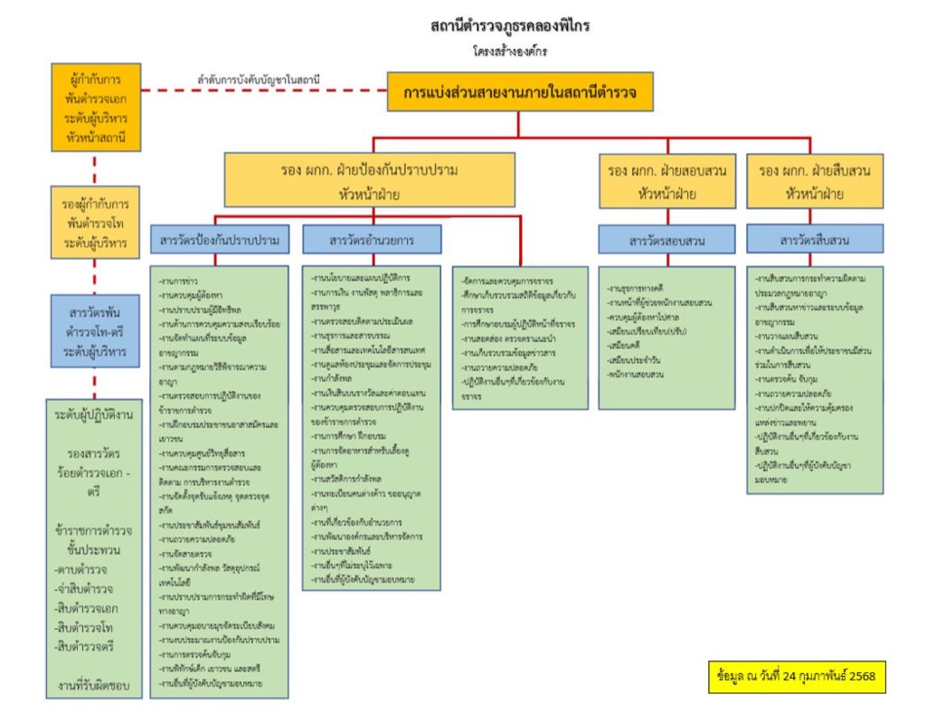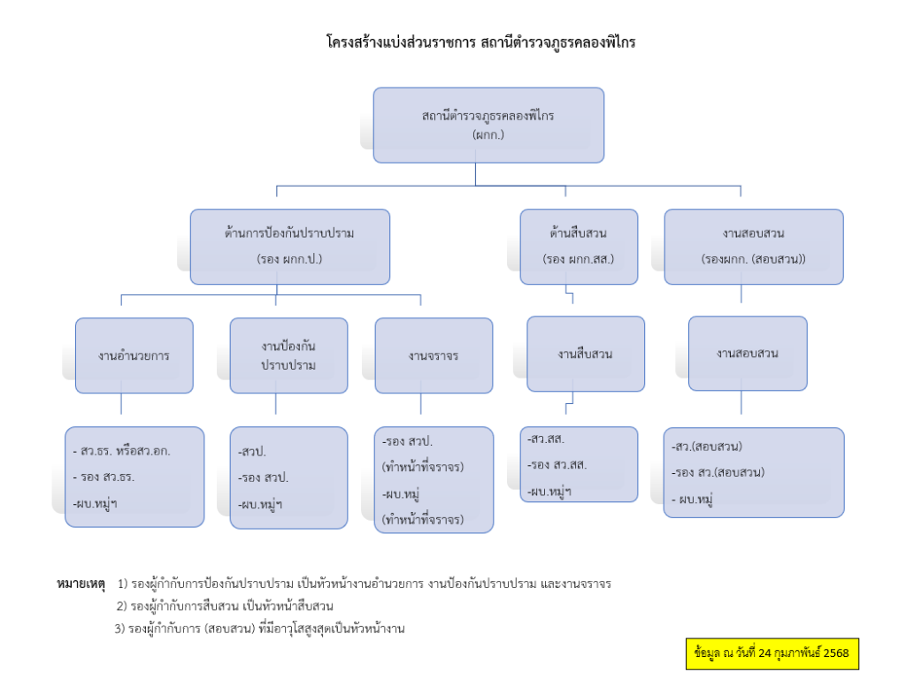 O1 โครงสร้างและอำนาจหน้าที่ 10 มีนาคม 2568 โดย สถานีตำรวจภูธรคลองพิไกร / ไม่มีหมวดหมู่ ลำดับบังคับบัญชาในสถานีตำรวจ โครงสร้างการแบ่งส่วนราชการ อำนาจหน้าที่และภารกิจของสถานีตำรวจ อำนาจหน้าที่ของสถานีตำรวจ อำนาจหน้าที่ของสถานีตำรวจ ตาม พ.ร.บ.ตำรวจแห่งชาติ มาตรา๖ คำสั่ง ตร.๕๓๗/๕๕ คำสั่ง ตร.๕๓๘/๕๕ อำนาจหน้าที่ตามกฎหมายอื่น พ.ร.บ.ตำรวจแห่งชาติ พ.ศ. ๒๕๖๕ ประมวลกฎหมายอาญา ประมวลกฎหมายพิจารณาความอาญา พ.ร.บ.จราจรทางบก พ.ศ.๒๕๒๒ คำสั่ง ตร. ๕๓๗/๒๕๕๕ เรื่องการกำหนดอำนาจหน้าที่ตำแหน่งในสถานีตำรวจ คำสั่ง ตร. ๕๓๘/๒๕๕๕ เรื่องการปฏิบัติและอำนาจหน้าที่ความรับผิดชอบของพนักงานสอบสวนและผู้ปฏิบัติงานสอบสวน คำสั่ง ตร. ๔๑๙/๒๕๕๖ เรื่อง การอำนวจความยุติธรรมในคดีอาญา การทำสำนวนการสอบสวน และมาตราการควบคุม ตรวจสอบ เร่งรัดการสอบสวนคดีอาญา ประมวลกฎหมายวิธีพิจารณาความคดียาเสพติด ๒๕๖๔ ประมวลกฎหมายยาเสพติด ๒๕๖๔ พระราชบัญญัติรถยนต์ พ.ศ. ๒๕๒๒ แผนบริหารราชการของสำนักงานตำรวจแห่งชาติ ประจำปีงบประมาณ พ.ศ. ๒๕๖๘ ๑๕ นโยบายการบริหารราชการ ประจำปีงบประมาณ พ.ศ. ๒๕๖๘ ยุทธศาสตร์สำนักงานตำรวจแห่งชาติ ๒๐ ปี